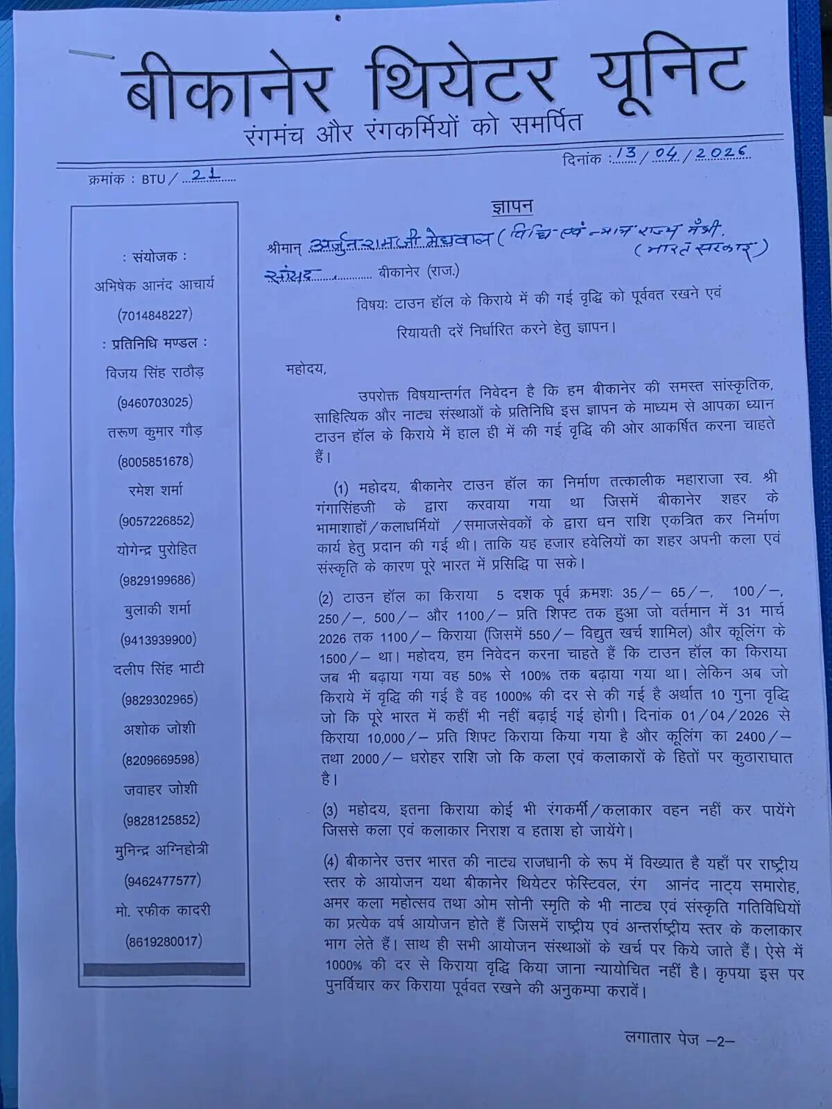 सोमवार को सभी रंगकर्मी सांसद व देश के कानून मंत्री अर्जुनराम मेघवाल सहित प्रशासन के अधिकारियों से मिले। सांसद ने कलाकारों को भरोसा तो दिलाया है कि वे किराया पुराना कराएंगे। मगर भूखे की भूख तो रोटी मिलने के बाद ही दूर होगी।