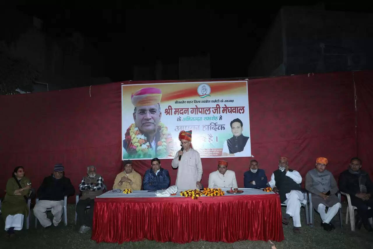 बीकानेर के नव नियुक्त जिलाकांग्रेस अध्यक्ष मदनगोपाल मेघवाल का स्वागत अभिनन्दन समारोह जस्सूसर गेट के अंदर मूमल गार्डन के आयोजित किया गया, युवा नेता जवाहर बाल मंच के पूर्व प्रदेश संयोजक अरुण व्यास द्वारा आयोजित स्वागत अभिनंदन में अपने स्वागत भाषण में अरुण व्यास ने कहा कि बीकानेर में पहली बार ऐसा हुआ ही कि किसी दलित समाज के व्यक्ति को कांग्रेस का जिलाध्यक्ष बनाया गया है जो कि गर्वित और हर्षित विषय है हम सभी ने अपने दावे पेश किए लेकिन पार्टी का जो निर्णय हुआ वो कार्यकर्ताओं के हक में हुआ है और अब हम सभी की यह महती जिम्मेदारी है कि हम सब मिलकर कांग्रेस पार्टी में एक ताकत के रूप में काम करते हुए संगठन को मजबूत करे मदनगोपाल जी को प्रशासनिक और संगठनात्मक स्वरूप और उसकी कार्ययोजना के बारे में अच्छे से जानकारी है और आने वाले समय में हम बीकानेर में कांग्रेस को मजबूत करेंगे इस अवसर पर बड़ी संख्या में उपस्थित सभी कांग्रेसजन और नेताओं ने एक स्वर में एक ताकत के रूप में कार्य करने के भरोसा दिलाया।