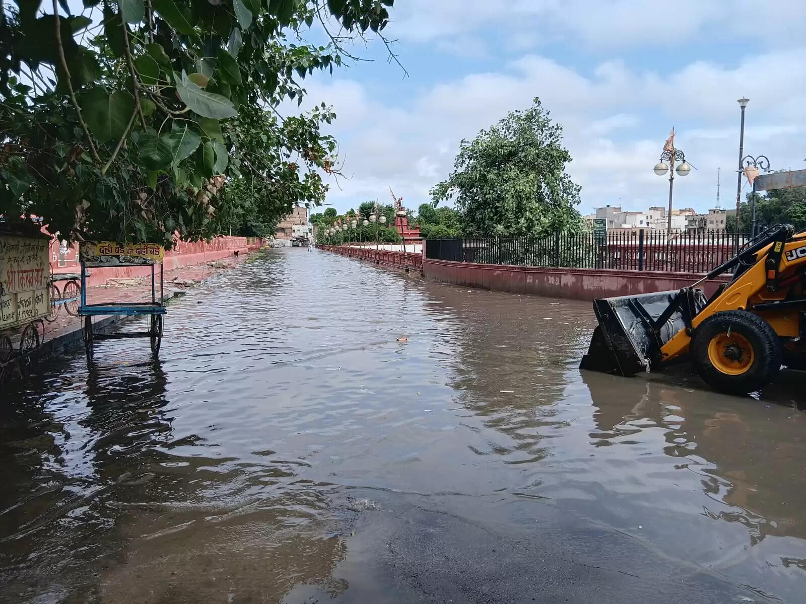 बीकानेर शहर में भी बीती रात से रुक-रुककर बारिश हो रही है। इस बारिश ने एक बार फिर विकास और सफाई के दावों की पोल खोल दी है। शहर में जगह-जगह पानी जमा हो गया है। जूनागढ़ के आगे तलब बन गया है। सूरसागर की टूटी दीवारों से सीढ़ियों पर झरने की तरह बहता हुआ पानी तालाब में पहुँच गया। यहां एक बार फिर नालों के मुहाने जेसीबी से खोलकर पानी को पंप कर निकालने की कोशिश शुरू हुई है। इसके बावजूद शहर में एक बार चर्चा शुरू हो गई है कि बीकानेर में विकास के नाम पर करोड़ों  रुपए खर्च करने के बाद भी प्रतिनिधियों द्वारा कोई मॉनिटरिंग नहीं होने से बदहाली झेलने को मजबूर होना पड़ा है।