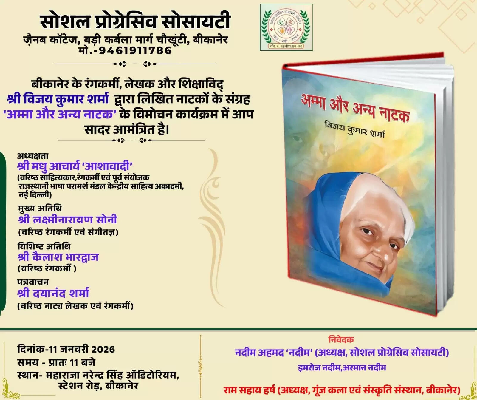 सोशल प्रोग्रेसिव सोसायटी के अध्यक्ष नदीम अहमद नदीम ने बताया कि इस नाट्य संग्रह के लोकार्पण समारोह की अध्यक्षता लेखक, रंगकर्मी मधु आचार्य ' आशावादी ' करेंगे। वरिष्ठ रंगकर्मी, संगीतकार लक्ष्मीनारायण सोनी मुख्य अतिथि के रूप में उपस्थित रहेंगे। नाट्य निर्देश कैलाश भारद्वाज इस समारोह के विशिष्ट अतिथि होंगे। नाटककार व रंगकर्मी दयानन्द शर्मा लोकार्पित होने वाली पुस्तक ' अम्मा और अन्य नाटक ' पर पत्रवाचन करेंगे।