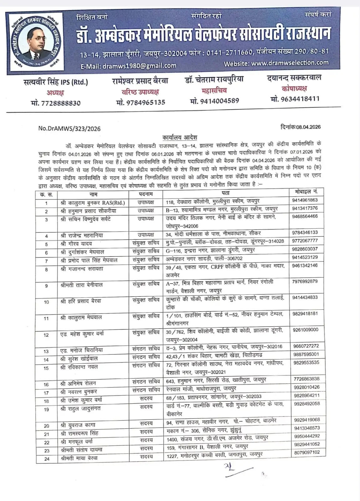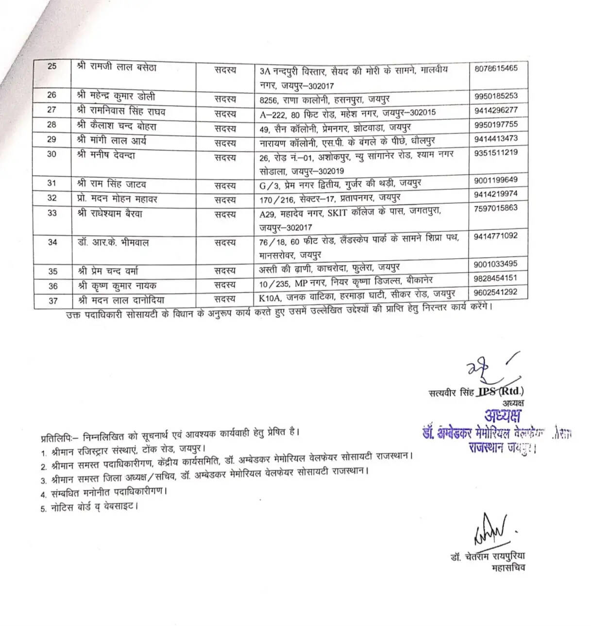 डॉ. आंबेडकर मेमोरियल फेयरवेल सोसायटी, राजस्थान के निर्वाचित अध्यक्ष सत्यवीर सिंह (सेवानिवृत्त आईपीएस) ने संगठन को मजबूत बनाने की दिशा में अहम कदम उठाते हुए अपनी केंद्रीय कार्यसमिति का विस्तार किया है। इसी क्रम में बीकानेर के सक्रिय सामाजिक कार्यकर्ता राहुल जादुसंगत को सोसायटी में प्रदेश सदस्य के रूप में नियुक्त किया गया है।