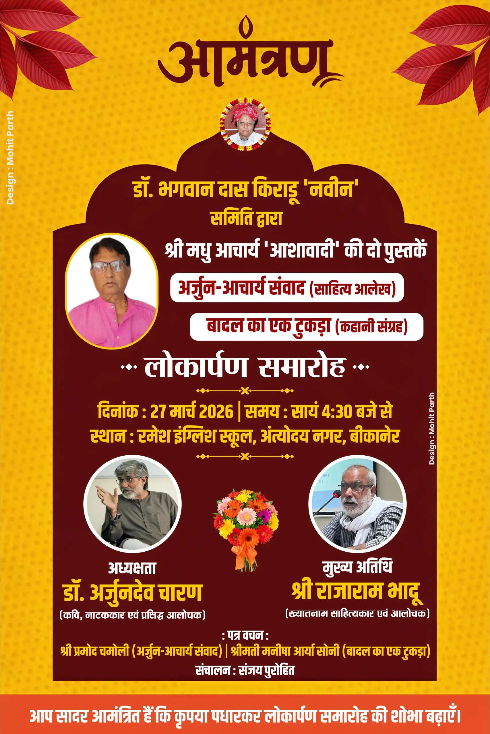 समारोह में मधु आचार्य के आलेख संग्रह ‘अर्जुन-आचार्य संवाद’ तथा कहानी संग्रह ‘बादल का एक टुकड़ा’ का विधिवत विमोचन किया जाएगा। कार्यक्रम की अध्यक्षता प्रख्यात कवि, नाटककार एवं आलोचक डॉ. अर्जुनदेव चारण करेंगे, जबकि मुख्य अतिथि के रूप में ख्यातनाम साहित्यकार एवं आलोचक राजाराम भादू उपस्थित रहेंगे।