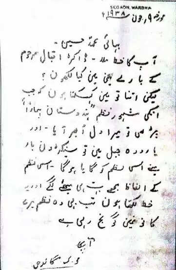 गांधी जी ने अपने मित्र मोहम्मद हुसैन साहब को उर्दू में एक खत तहरीर किया जिसमें अल्लामा इक़बाल का जिक्र किया गया है जिसका हिंदी तर्जुमा है