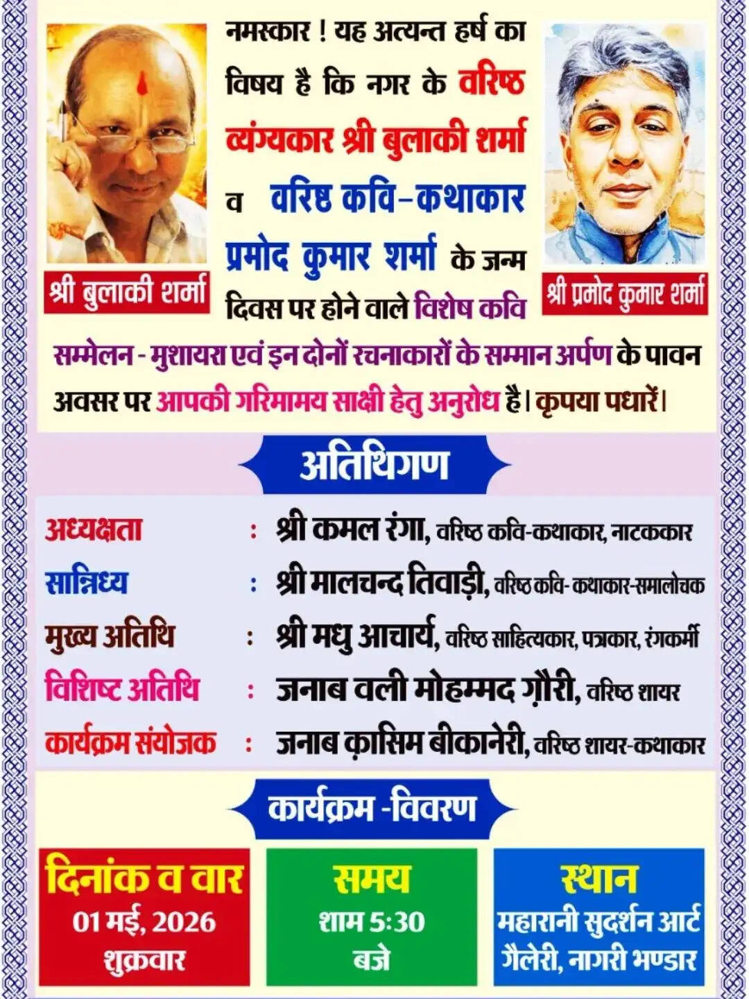 वरिष्ठ साहित्यकार बुलाकी शर्मा व प्रमोद कुमार शर्मा के जन्मदिन 1 मई को महारानी सुदर्शना कुमारी कला दीर्घा, नागरी भंडार, स्टेशन रोड में कवि सम्मेलन एवं मुशायरा शाम 5.30 बजे आयोजित होगा। इस आयोजन में दोनों रचनाकारों का सम्मान भी किया जाएगा।