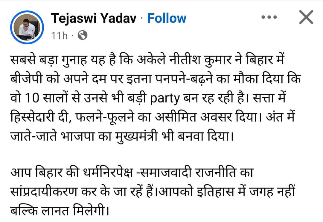 अपनी फेसबुक पोस्ट में तेजस्वी ने नीतीश के लिए लिखा है कि आप बिहार की धर्मनिरपेक्ष - समाजवादी राजनीति का साम्प्रदायीकरण करके जा रहे है। आपको इतिहास में जगह नहीं बल्कि लानत मिलेगी।