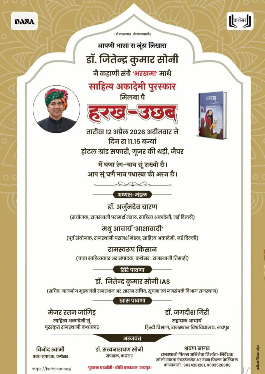 साहित्य अकादेमी, नई दिल्ली का वर्ष 2025 का राजस्थानी का सर्वोच्च पुरस्कार इस बार कवि, कथाकार, मुख्यमंत्री के सचिव, सूचना एवं जनसंपर्क विभाग के शासन सचिव डॉ जितेंद्र कुमार सोनी को उनके कहानी संग्रह ' भरखमा ' पर अर्पित हुआ है। उनको यह पुरस्कार 31 मार्च को नई दिल्ली में राष्ट्रीय साहित्योत्सव में अर्पित हुआ था।