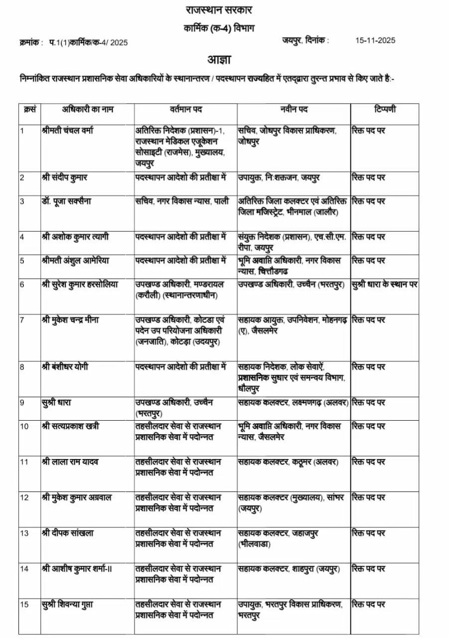 राजस्थान की भजन लाल सरकार लगातार बड़े प्रशासनिक फेरबदल करती जा रही है। एक बार फिर सरकार ने 22 RAS अधिकारी इधर-उधर किए हैं। इस ट्रांसफर लिस्ट में 13 ऐसे अधिकारी शामिल हैं जो तहसीलदार से RAS बने हैं।