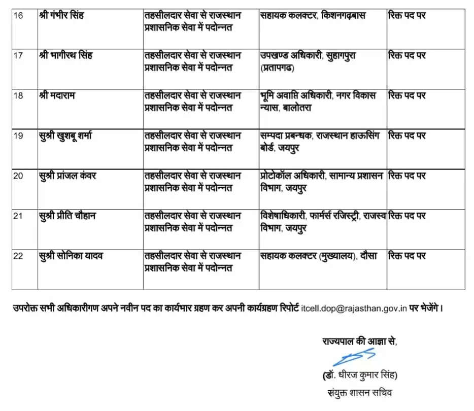 RAS Transfer : तहसीलदार से RAS बने 13 साहित 22 RAS अधिकारी इधर-उधर