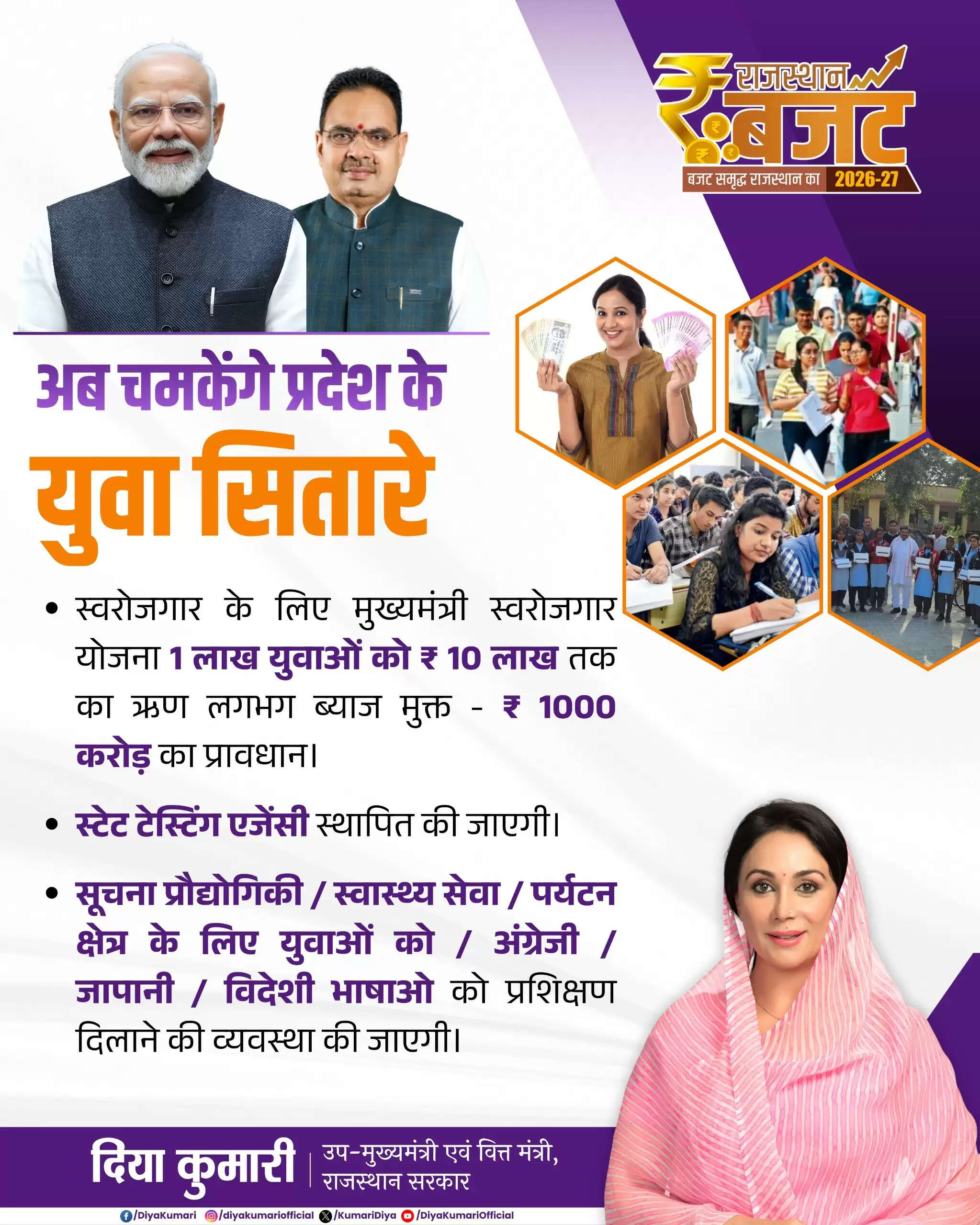 - मुख्यमंत्री युवा स्वरोजगार योजना के तहत एक लाख युवाओं को 10 लाख रुपये तक के ऋण पर ब्याज अनुदान के लिए 1,000 करोड़ रुपये का प्रावधान किया गया है ।